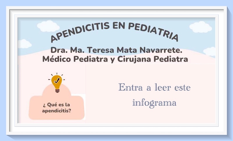 En este infograma trataré el tema sobre la apendicitis en pediatría, como parte fundamental de reflexión para atender preventivamente a todos los maravillosos niños y niñas. Les invito a leerlo: _____________________________ _____________________________ La Doctora Tere Mata, pediatra y cirujana pediatra con estudios de especialización en la UNAM a través del Centro Médico Nacional 20 de Noviembre del ISSSTE, así como en el […]