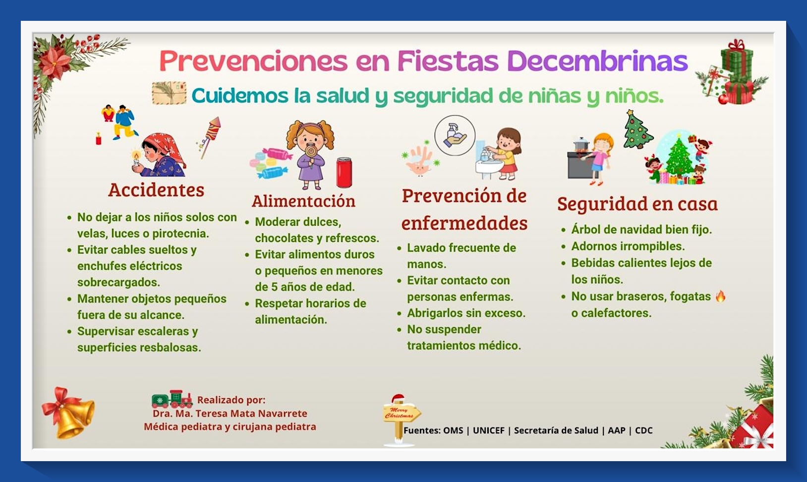 En este infograma trataré el tema sobre las Prevenciones en las Fiestas Decembrinas –cuidemos la salud y la seguridad de nuestros niños-, justo en estos días de vacaciones y celebraciones invernales en México. Fundamental reflexión para conocer cómo debemos hacer para prevenir, cuidar y atender a los maravillosos niños.